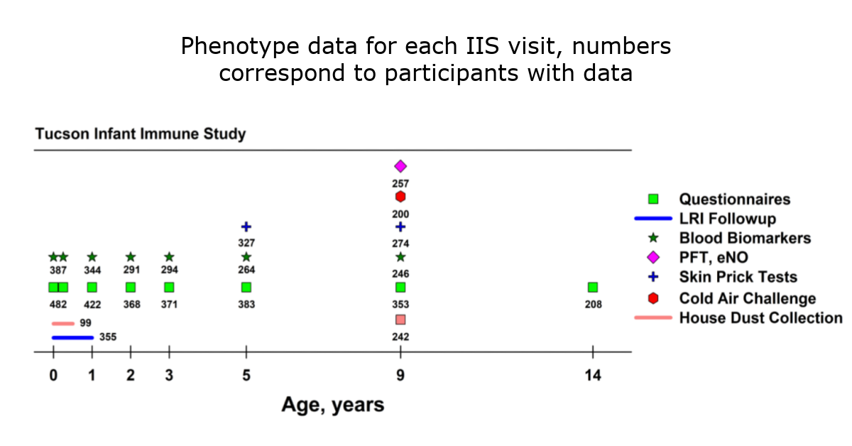 The IIS was continuously funded by the National Institutes of Health through 2013. Starting with the prenatal maternal visit, samples and questionnaires have been collected from the mothers, fathers and enrolled children at regular intervals. Including the collection of umbilical cord blood, there have been 7 evaluations completed at ages 3 months, 1, 2, 3, 5, and 9 years of age. At each evaluation, a blood sample was collected and peripheral blood mononuclear cells isolated. A portion of the cells were frozen (fresh frozen) and a portion were cultured and stimulated with mitogens, allergens, respiratory syncytial virus, and lipopolysaccharide. The culture supernatants were then collected and stored for measurement of biomarkers. We have completed measurements of many biomarkers including IFN-y, IL-4, IL-5, IL-10, IL-12, IL-13, and TNF-a. In addition to the blood sample drawn for cell cultures, additional blood samples were drawn for serum/plasma, DNA extraction and complete blood cell counts. Serum/plasma levels of total IgE and allergen-specific IgE to several aeroallergens and foods have been completed. At age 9 years, children performed pulmonary function testing (PFT) and bronchial hyper-responsiveness testing (cold air challenge). Allergy skin prick tests to local aeroallergens were performed on the children at ages 5 and 9 years and on the parents when the children were 5 years old.