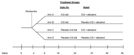 - placebo ICS twice daily and use of placebo ICS + albuterol as reliever do not differ in their effects on the time to first asthma exacerbation